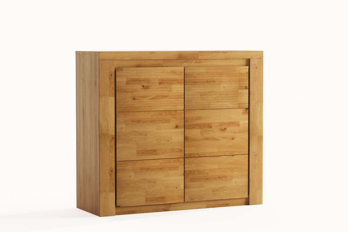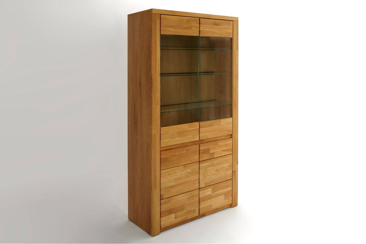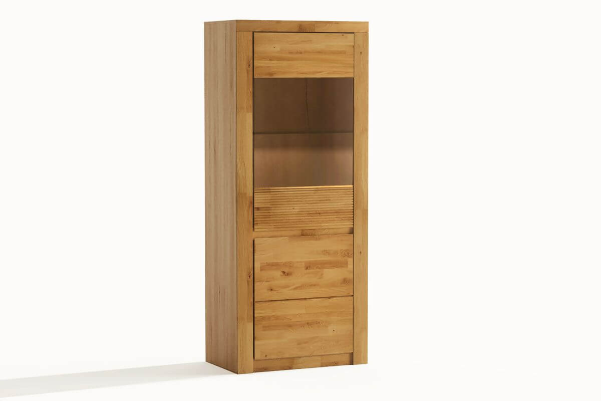 Fronty mebli z kolekcji BRUNO wykonane są w 100% z naturalnego dębu, olejowanego, dzięki czemu drewno uwydatnia swój piękny, naturalny złocisty kolor. Uchwyty do tej kolekcji frezowane są w naturalnym drewnie.